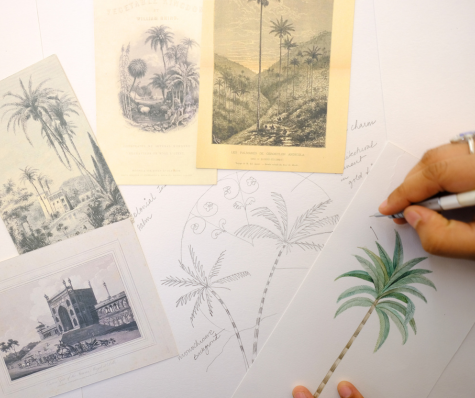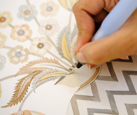 Using a traditional approach that begins with pencil and paper, projects are initiated with the selection of a printing technique, followed by hand-drawing, tracing, and meticulously painting for each colorway. Every color scheme is individually developed to compliment the design, rather than using premade palettes.